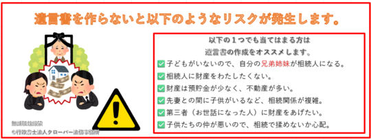このようなリスクが多いため、大阪市福島区の皆様から遺言書作成の多数のご相談をいただいております。