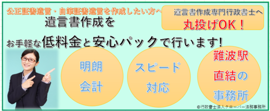 難波駅直結の便利な遺言書作成専門の行政書士事務所です。